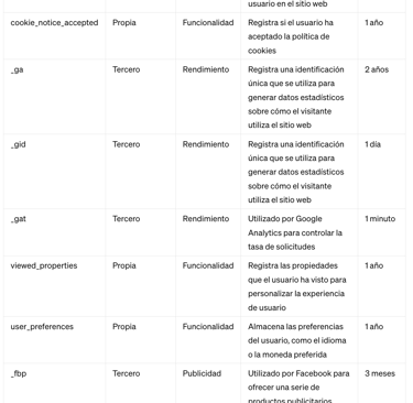 La mayoría de las cookies que utilizamos en nuestro sitio web pueden clasificarse como cookies esenciales. No obstante, también utilizamos cookies de terceros, concretamente de Google Analytics. A continuación mostramos un cuadro con las cookies que empleamos y su finalidad.